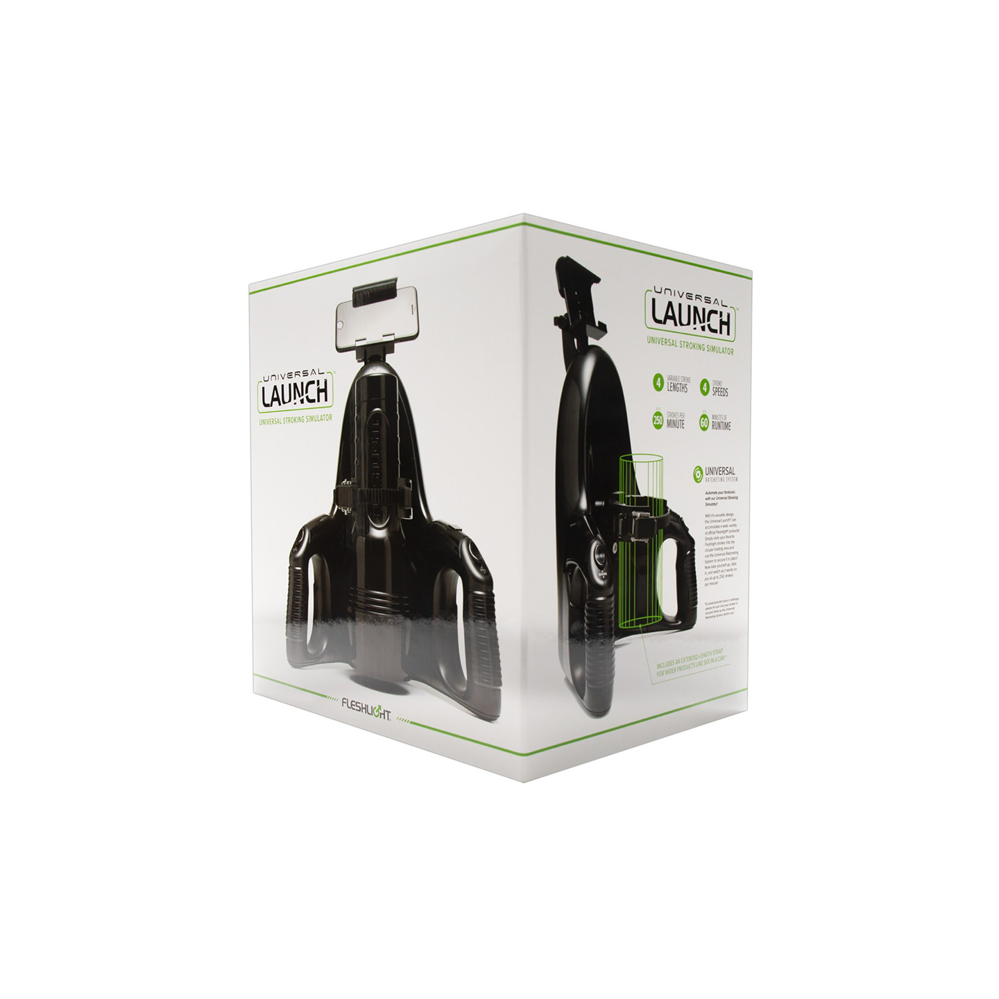 L'Universal Launch est un adaptateur pour masturbateur entièrement automatique qui peut être combiné avec n'importe quel masturbateur Fleshlight (non fourni). Il suffit de placer le masturbateur dans l'Universal Launch de manière fixe et sûre, puis de le faire monter et descendre automatiquement et plus ou moins vite en appuyant sur un de ses deux boutons situé sur les poignées.