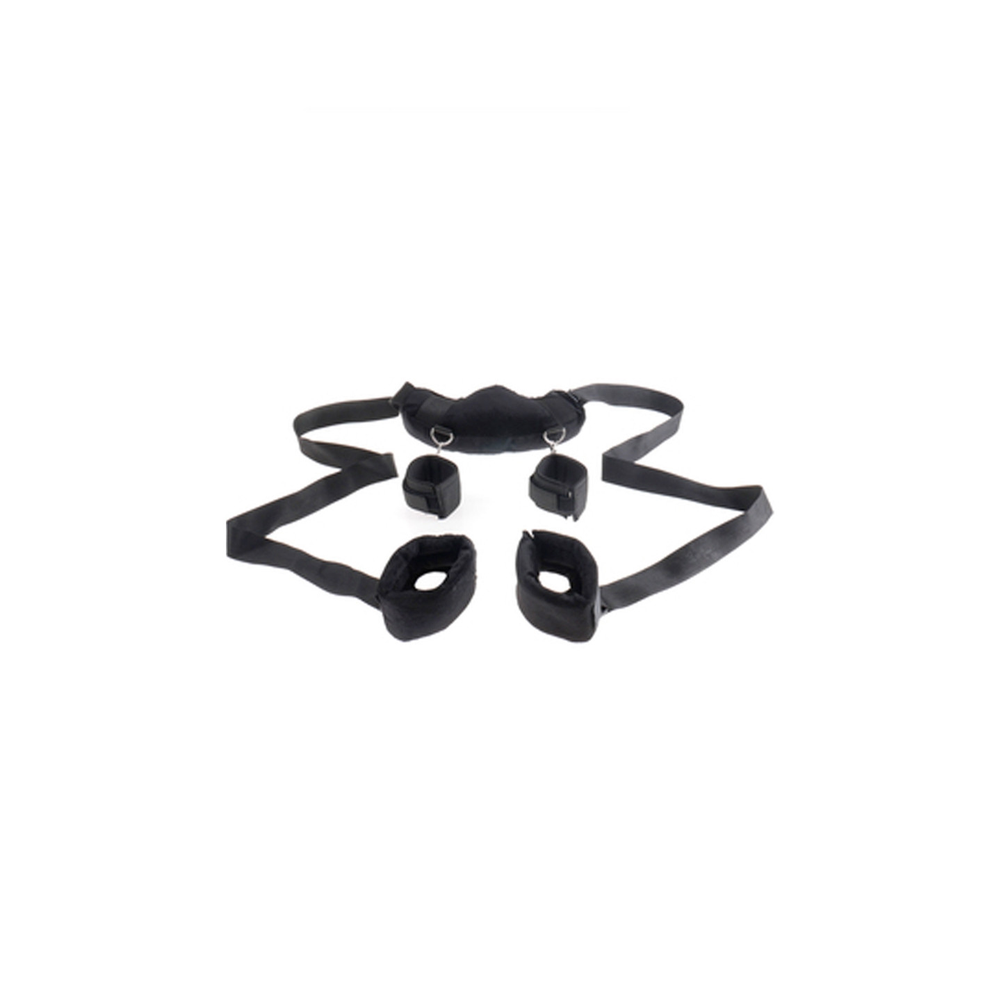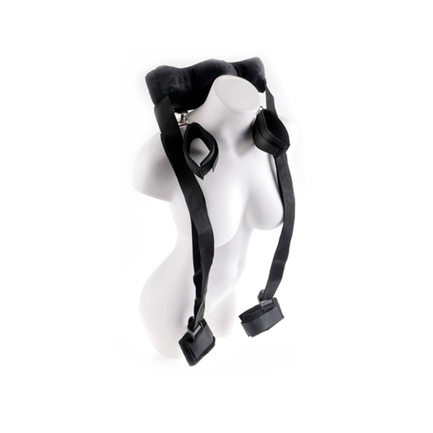 Le harnais se passe autour du cou ou derrière la nuque en fonction de votre position favorite. Les sangles en nylon sont robustes et réglables. Elles relient le harnais aux menottes de chevilles et maintiennent fermement vos jambes en position. Ainsi, vous ne risquez pas de vous fatiguer au moment où ça devient le meilleur!