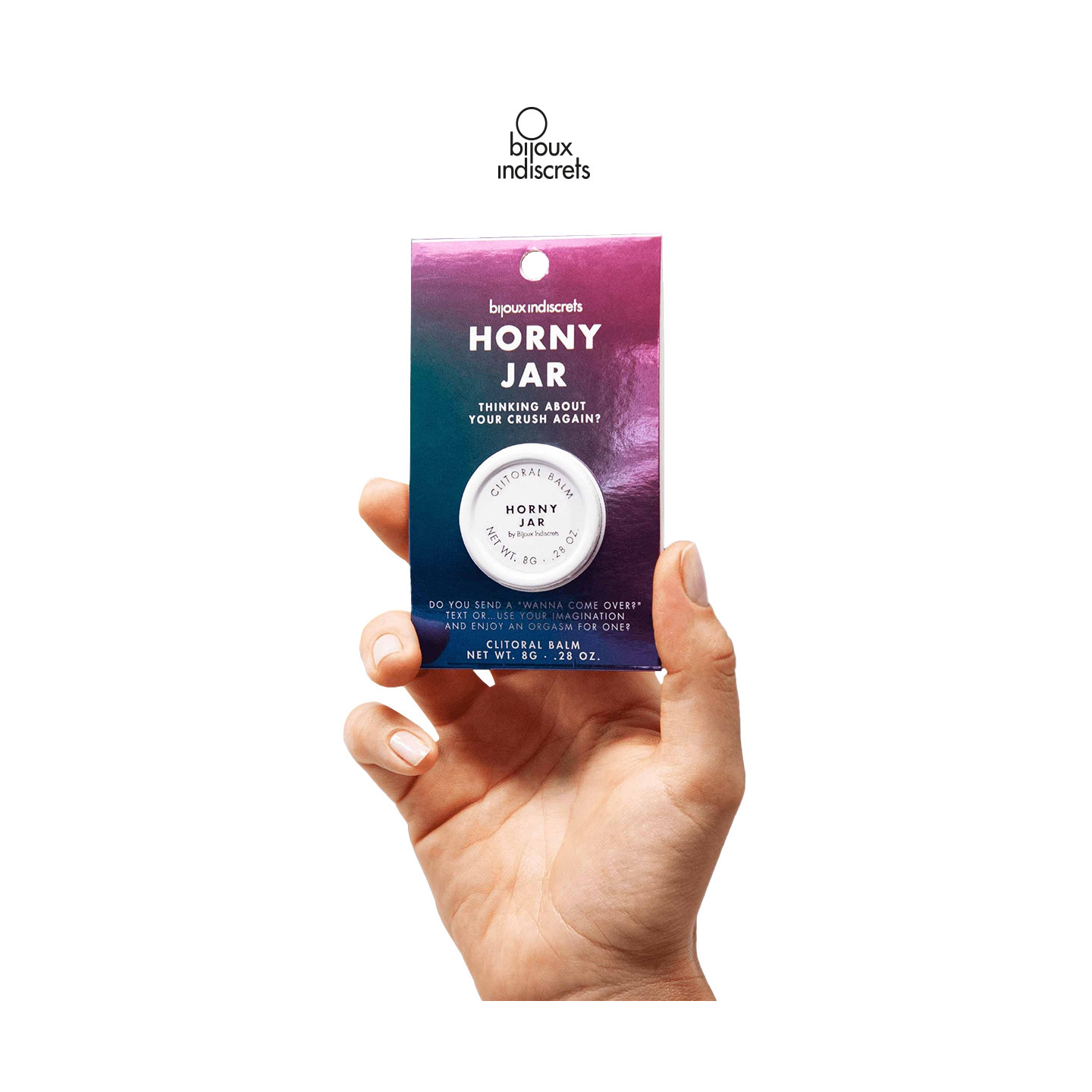 Bijoux Indiscrets la célèbre marque Espagnole de cosmétiques intimes présente son baume clitoridien Horny Jar. Cette cosmétique spéciale stimulation du clitoris se présente dans une petite boite sous forme dun baume à étaler avec le doigt. Ce baume stimulant est discrètement parfumé au Bois de sental.