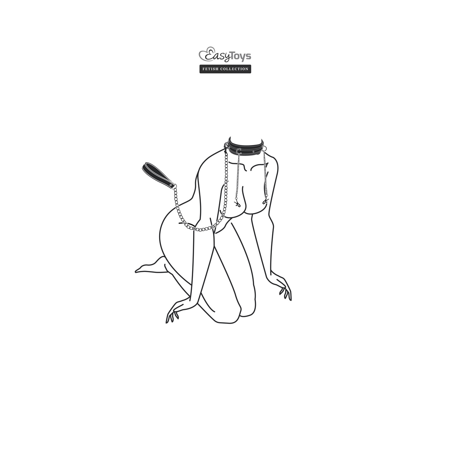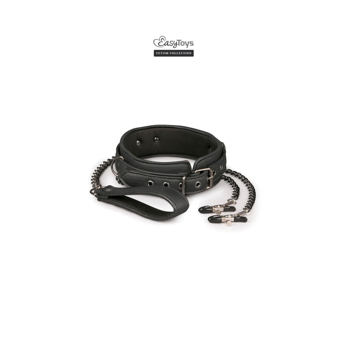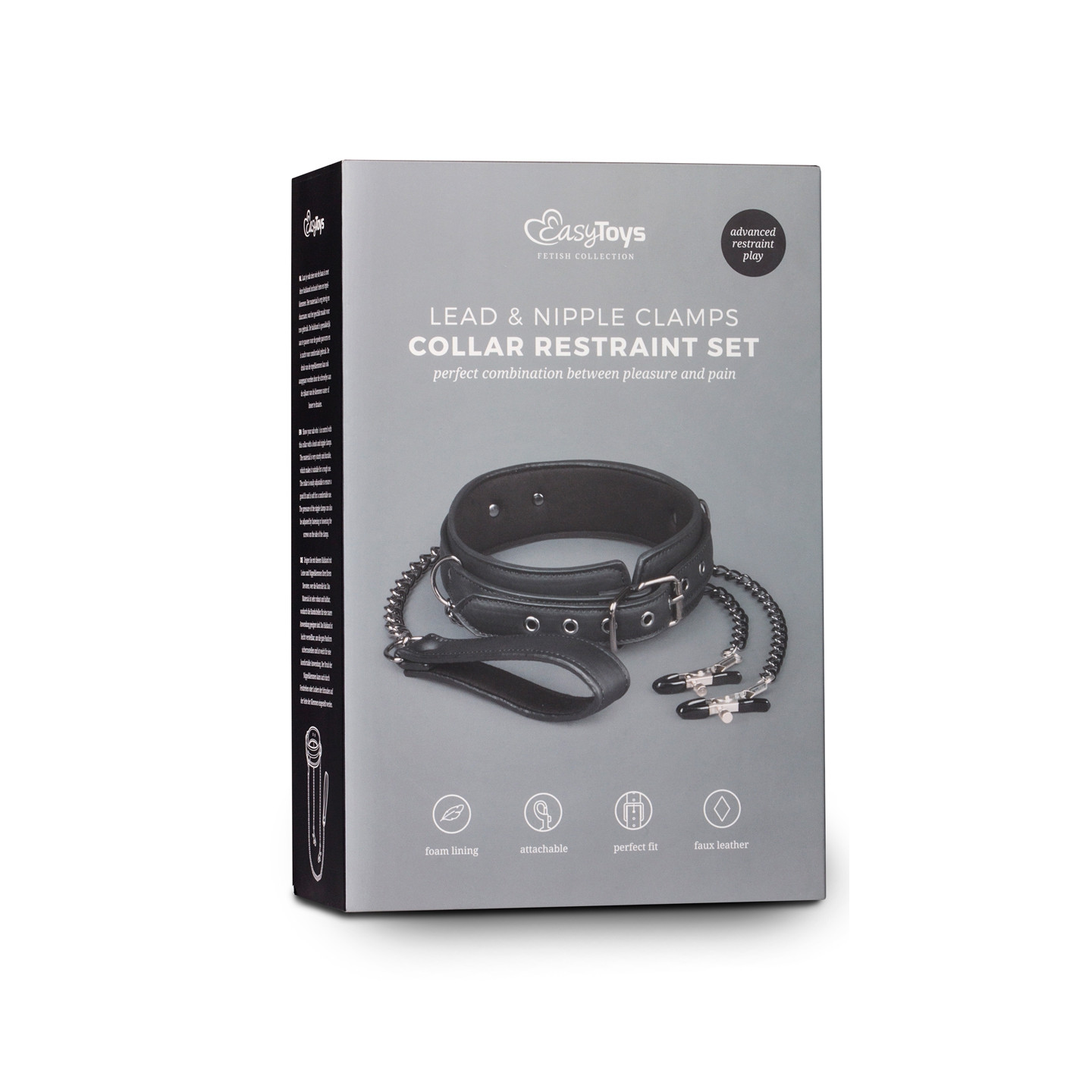 Conçu en cuir synthétique et métal, l'ensemble Collier + laisse + pinces à seins "Collar Restraint Set" de la marque Easytoys Fetish Collection présente un aspect luxueux.