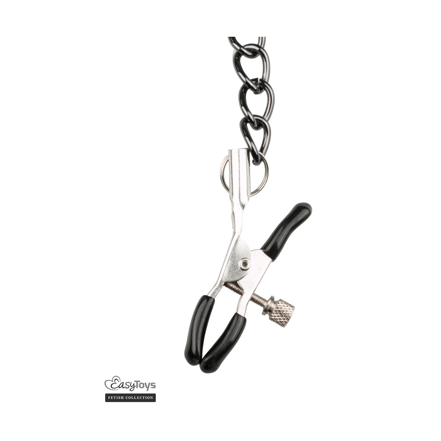 Souple, confortable et réglable, le collier s'ajuste facilement autour du cou pour bien tenir en place. Il est relié à une paire de pinces à seins par l'intermédiaire de chaînes métalliques.