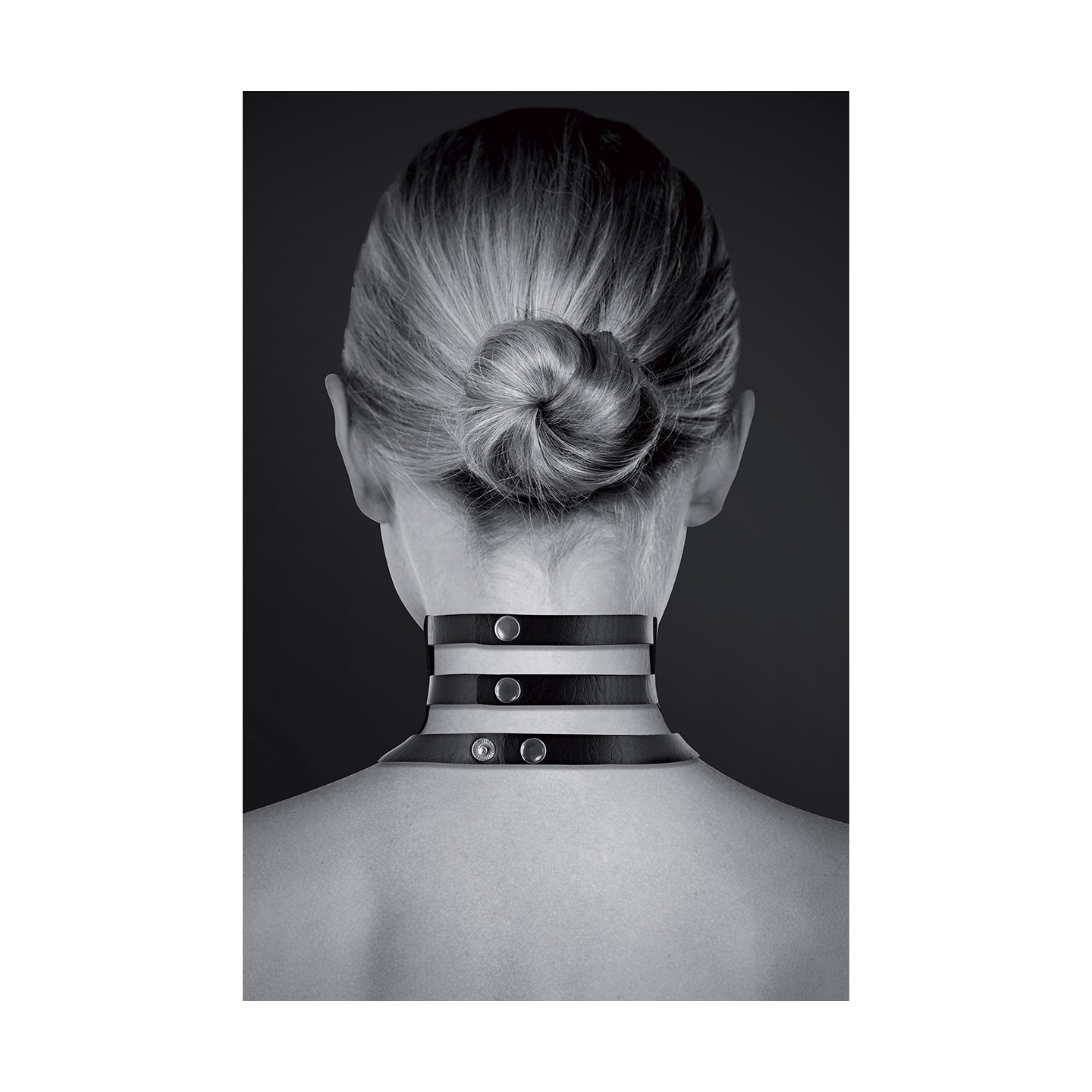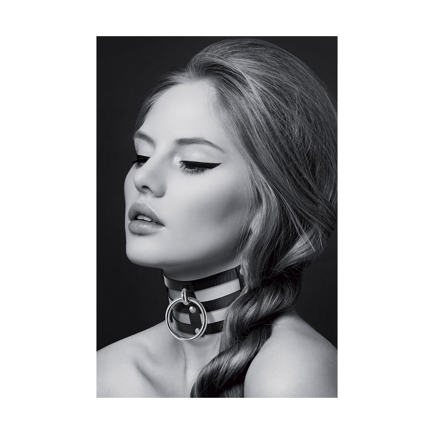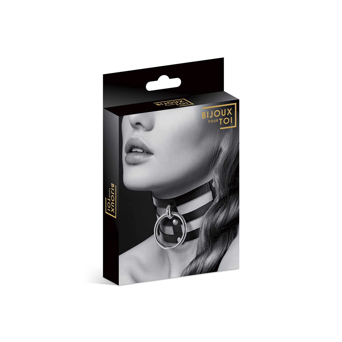 Avec son anneau solide en métal argenté sur le devant, ce collier noir, à la fois ras de cou et large, de la marque Bijoux pour toi, vous donnera un look très Fetish SM.