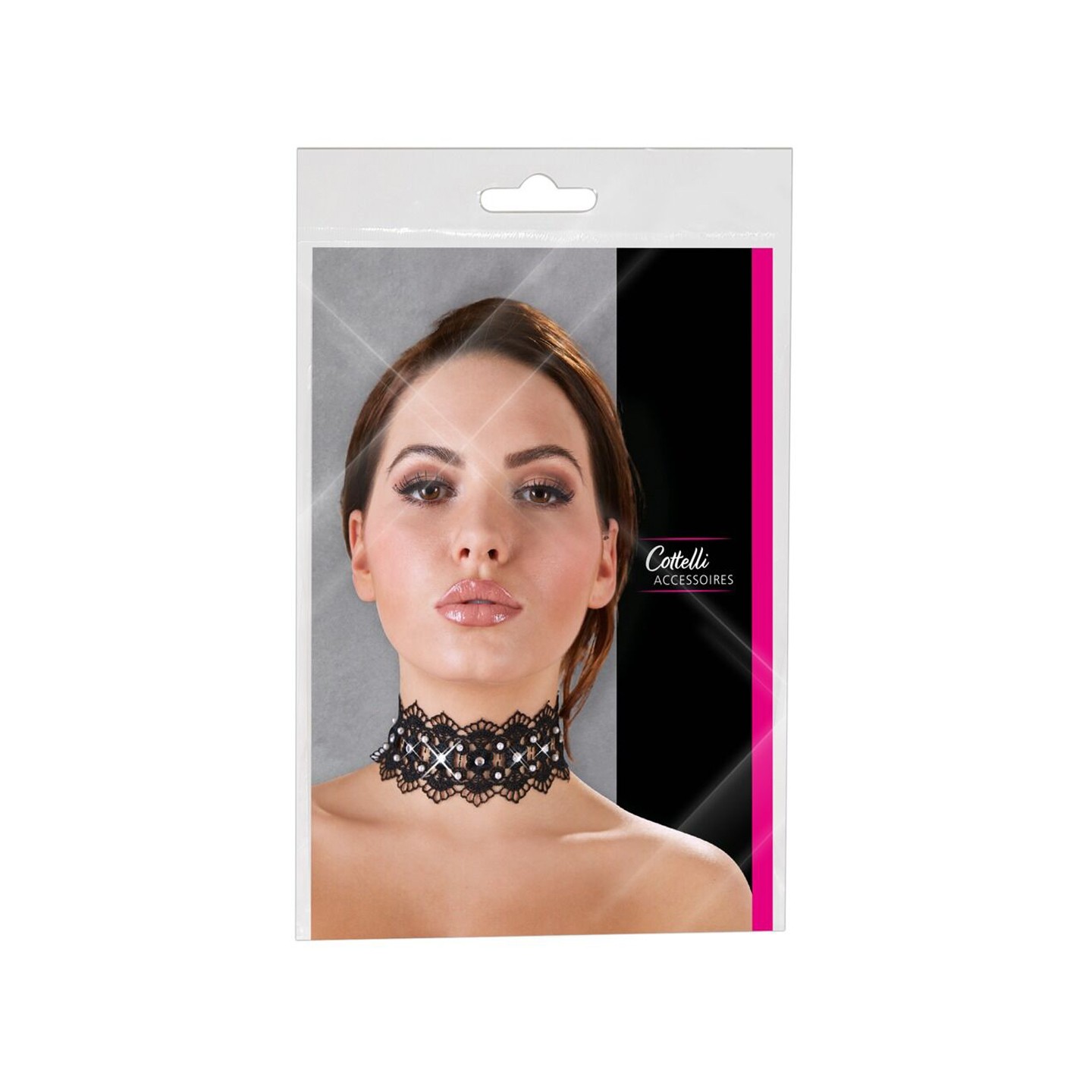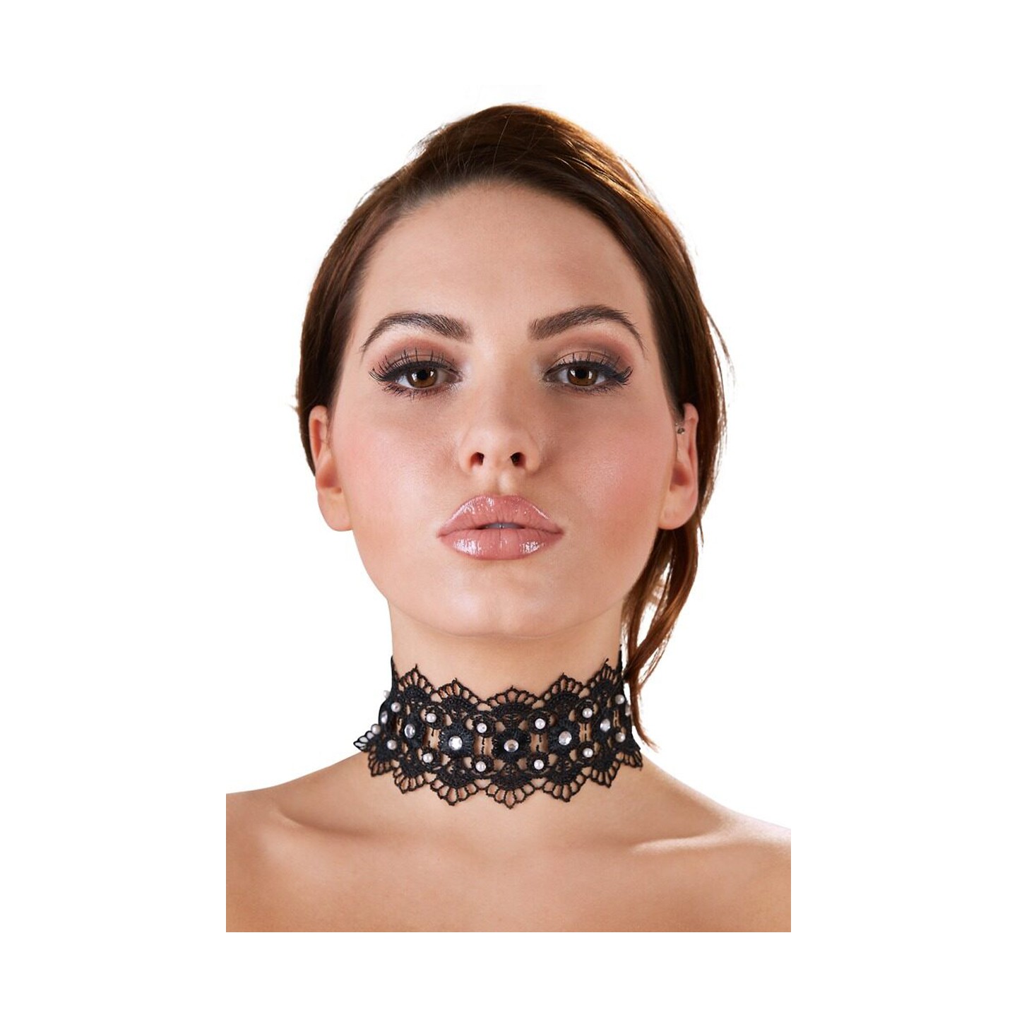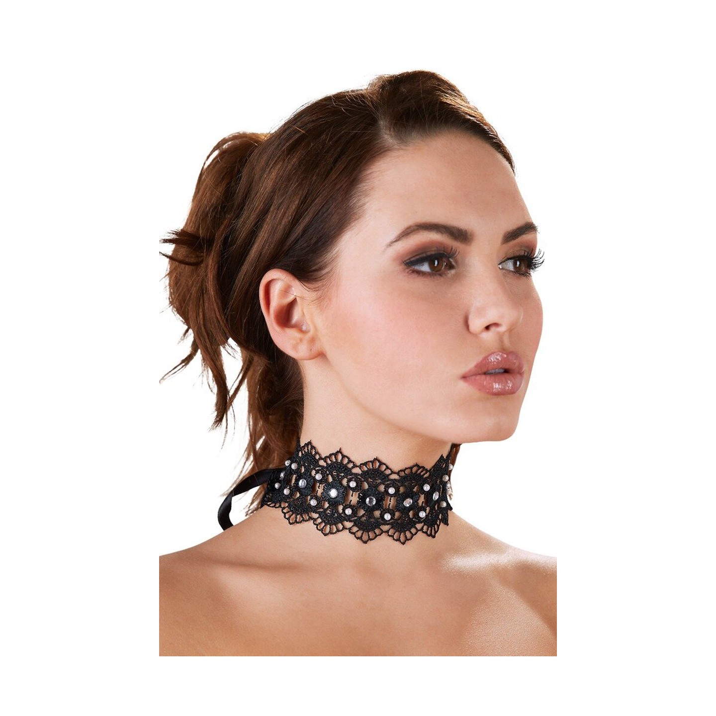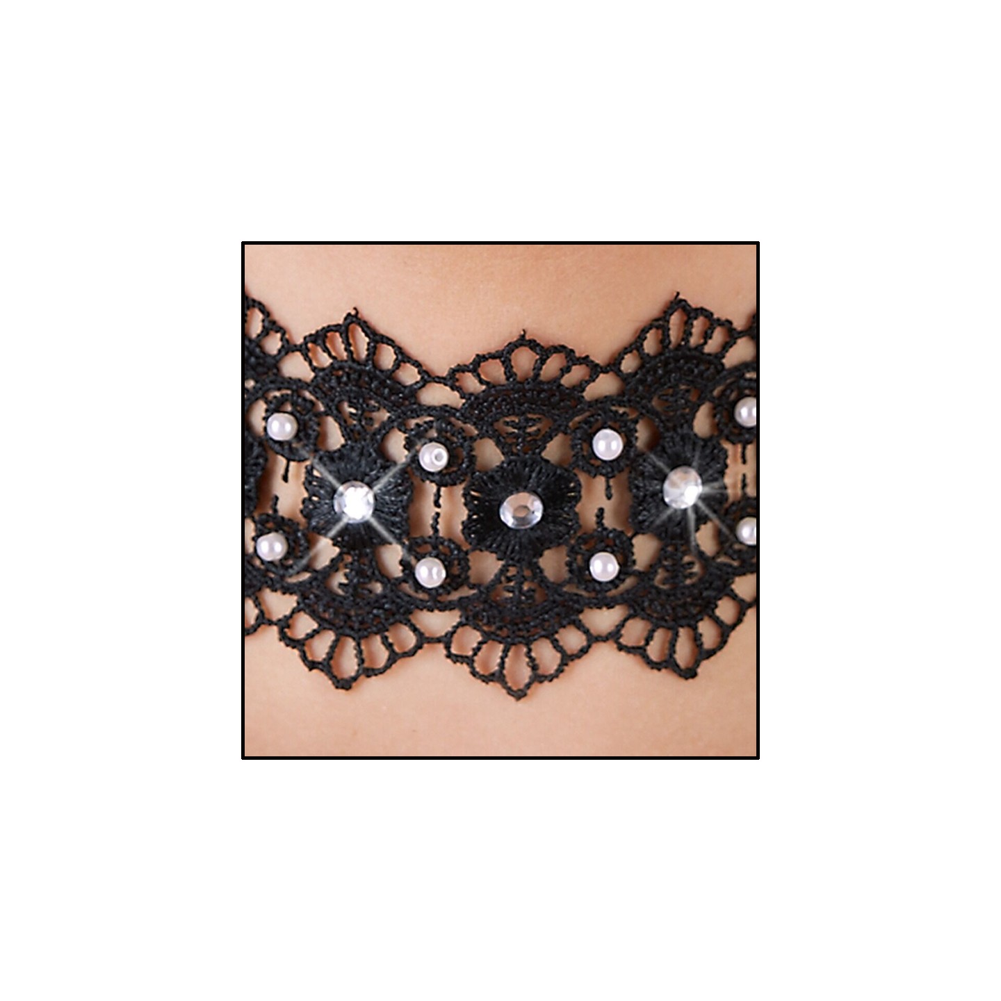 Magnifique collier noir brodé, orné de perles blanches et de strass, avec à l'arrière un nud en satin à nouer.