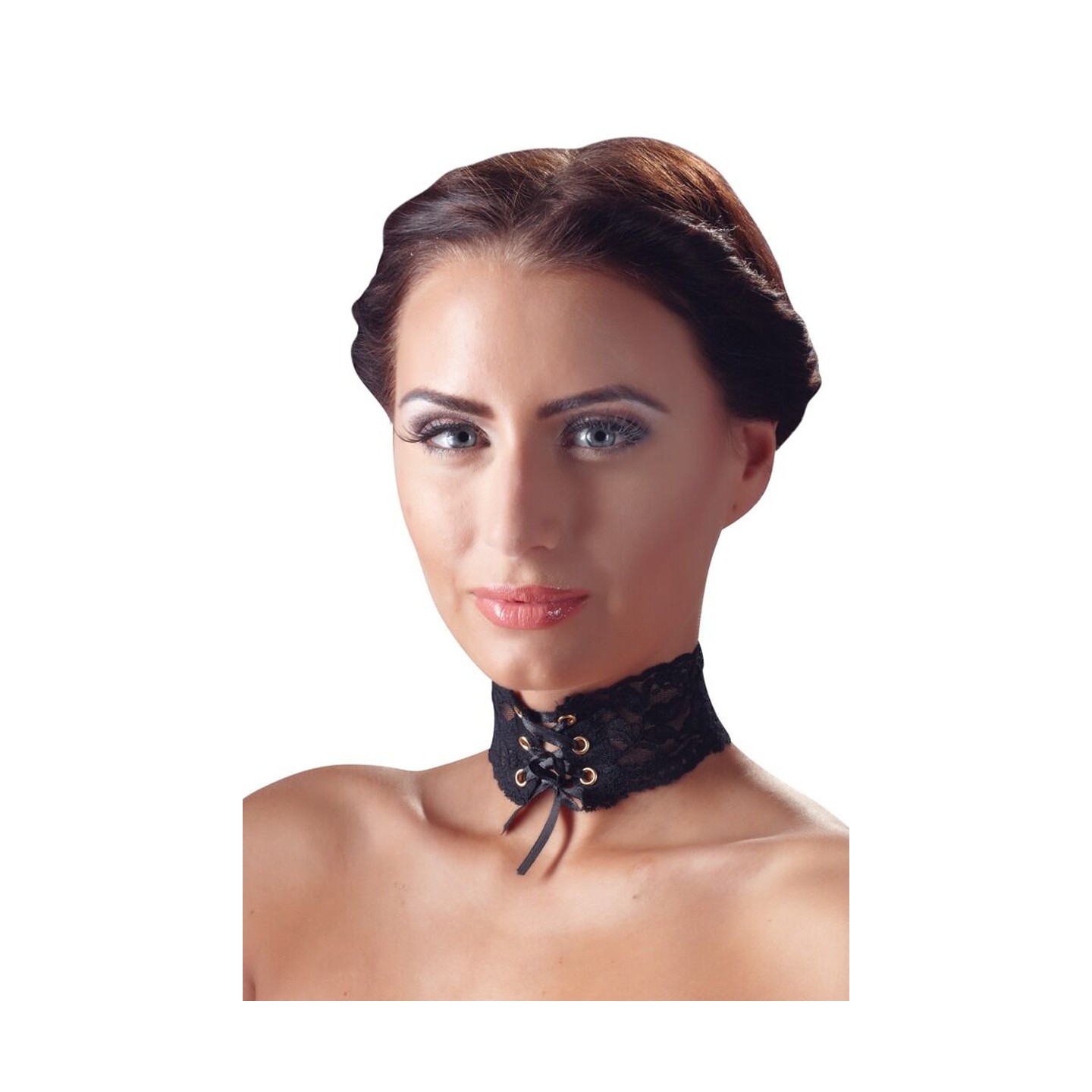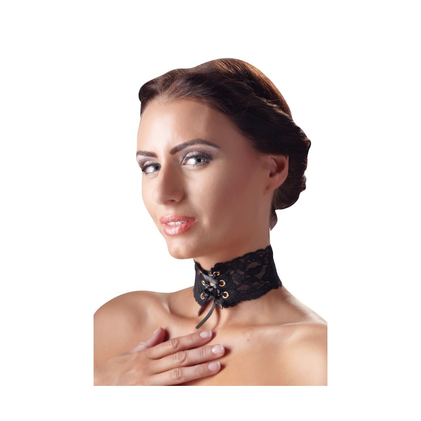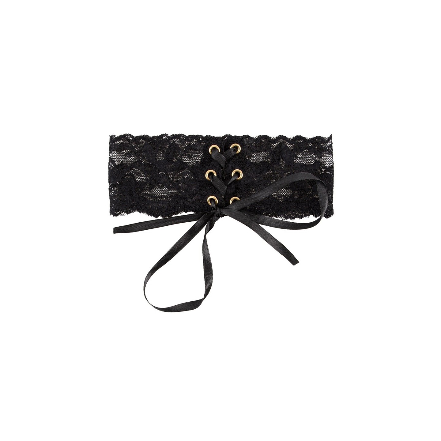 Magnifique collier en ruban de dentelle noire, avec 6 oeillets et un laçage en ruban de satin pour fermer et régler la longueur. La fermeture peut être portée à l'arrière ou à l'avant.