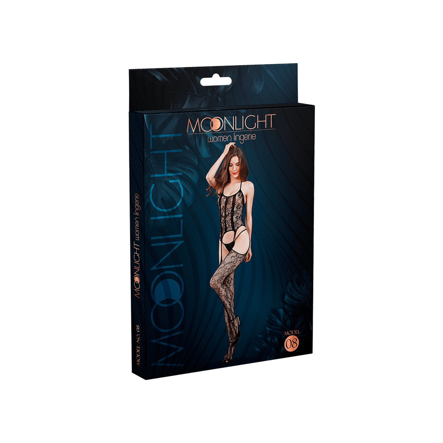 La marque de lingerie Moonlight présente son modèle n° 8, une combinaison sexy en fine résille noire et légèrement transparente avec porte-jarretelles intégré.