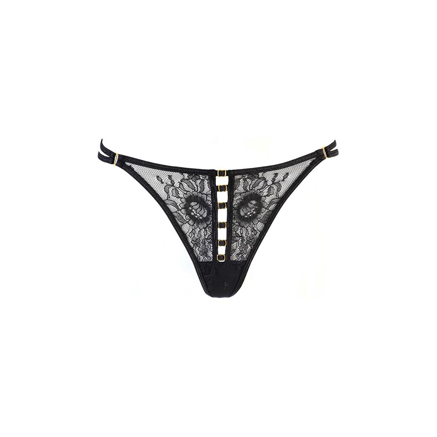 A l'avant la dentelle délicate est dotée d'une ouverture verticale maintenue par des petites bandes élastiques décorée d'un petit bijou dorée semblable à un passant de bretelle.