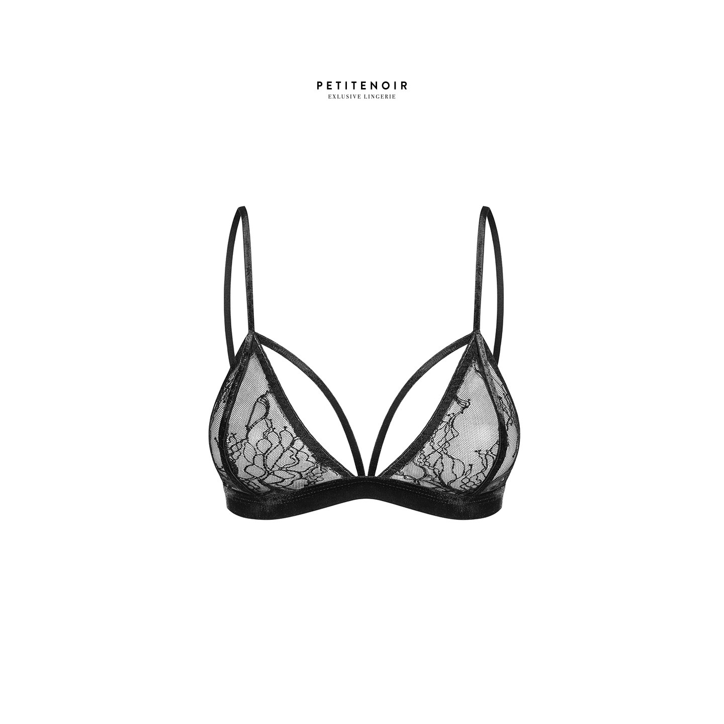 Elégant et stylé, il capture les seins dans de mini triangles de fine dentelle transparente, soulignés par deux étroits rubans de velours qui galbent la poitrine.