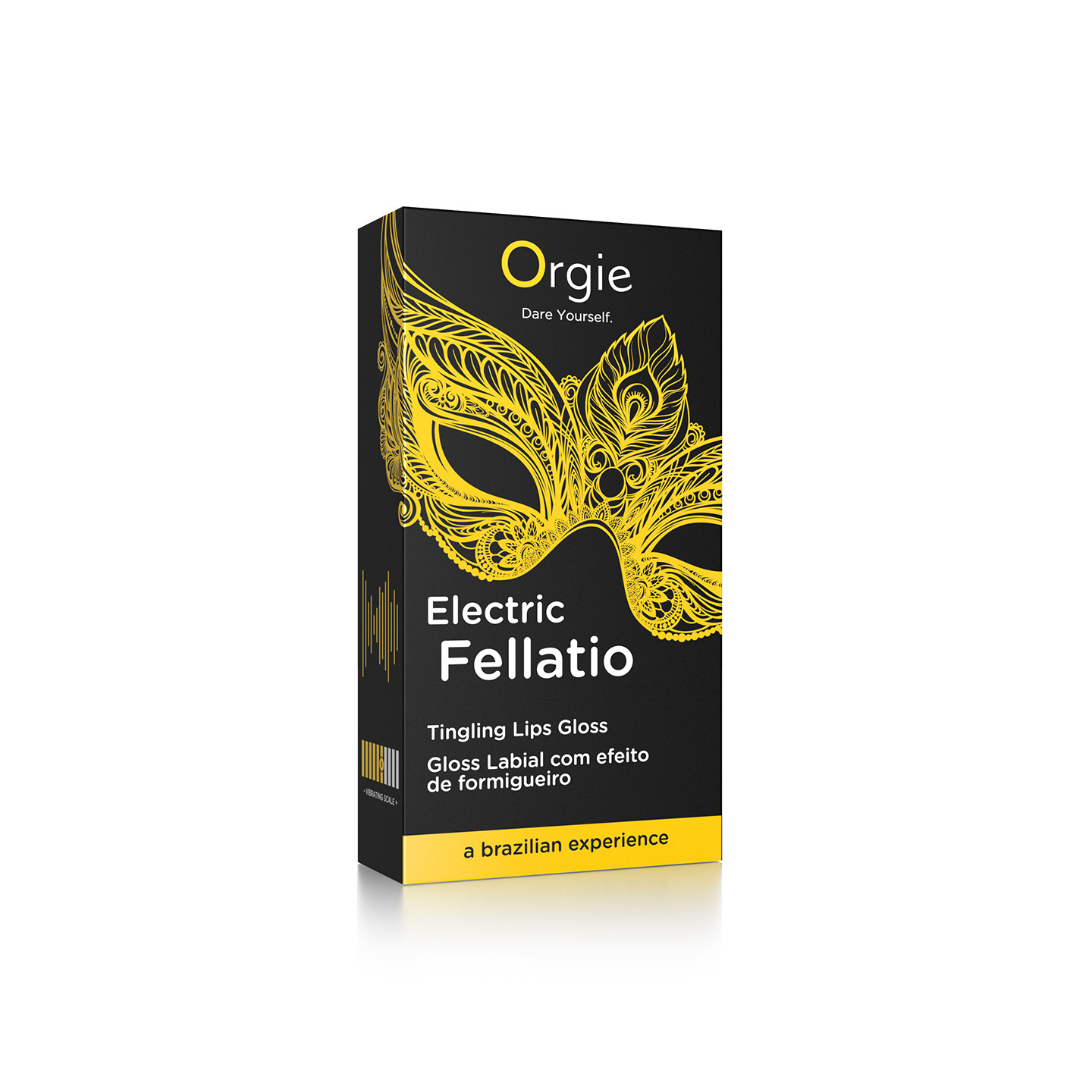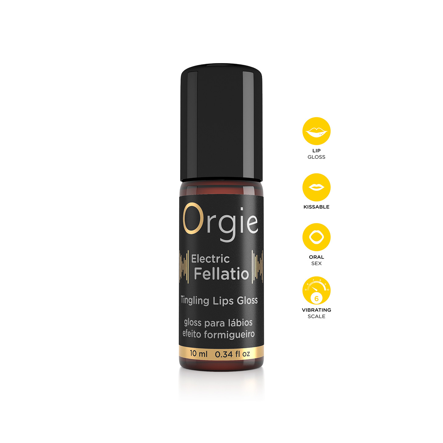 "Orgie Electric Fellatio Lip Gloss" est le gloss / Brillant à lèvres excitant parfumé au Tutti Frutti, avec effets vibrants et picotements instantanés, de la marque de cosmétique érotique Orgie.