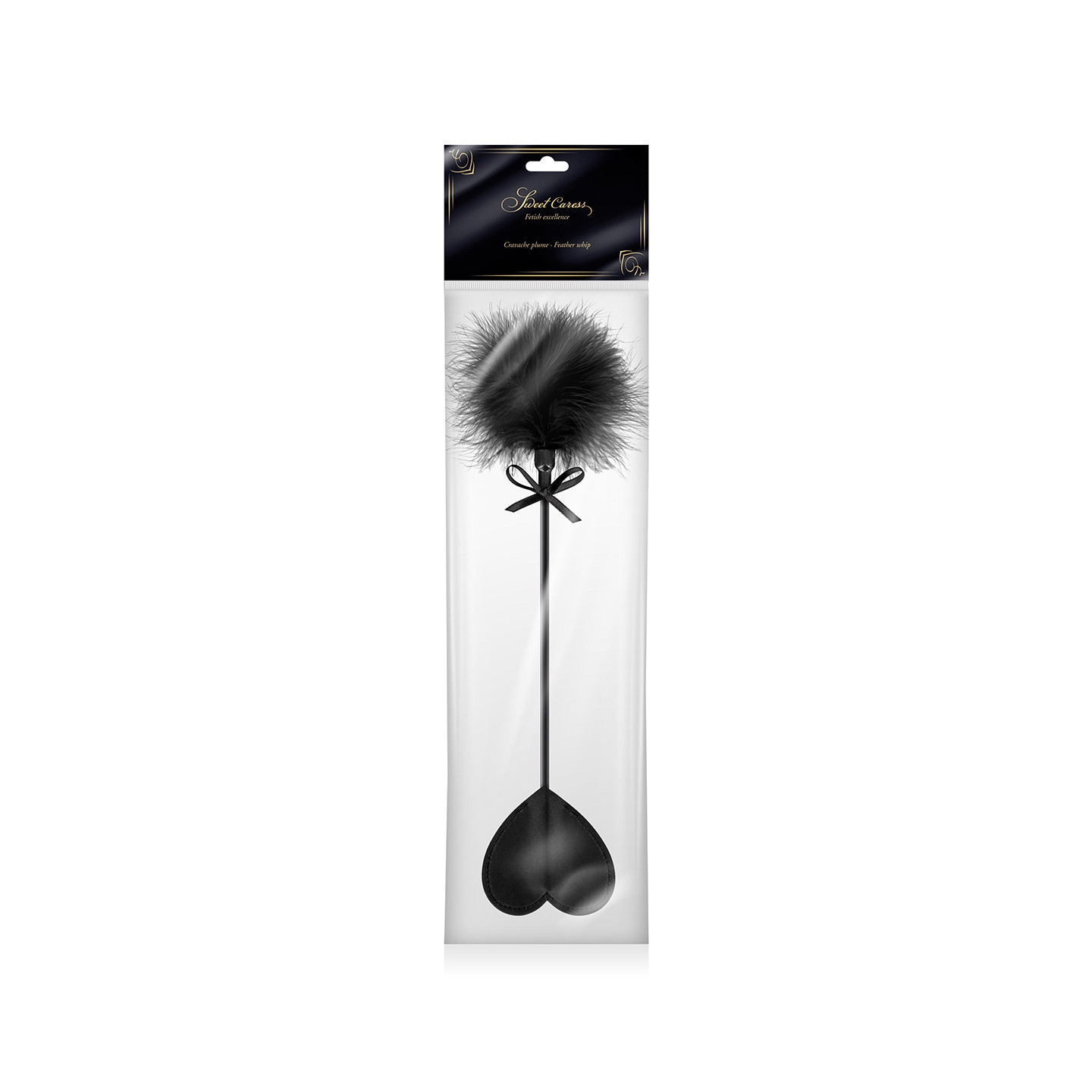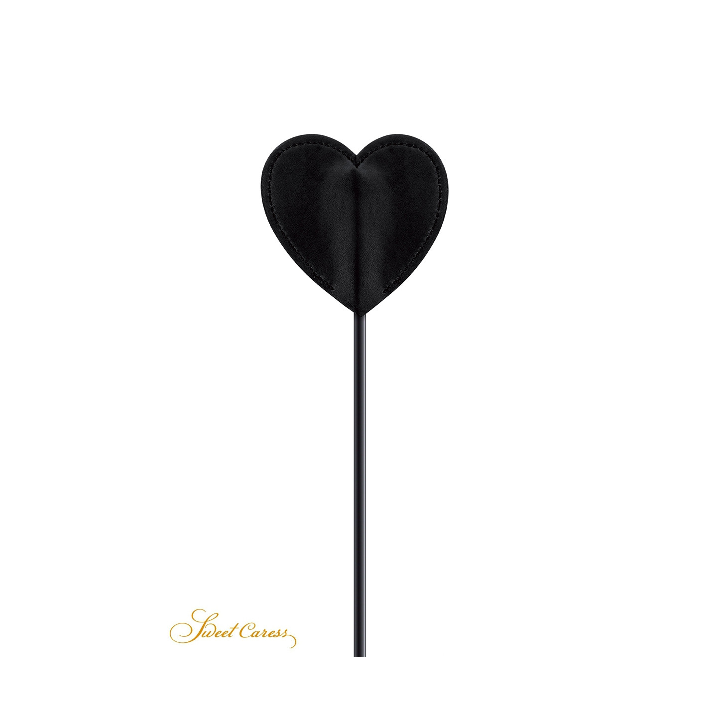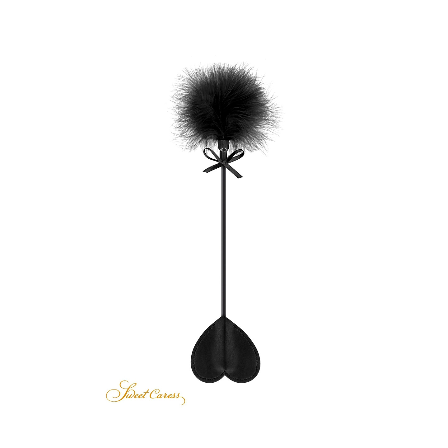 Un accessoire BDSM 2 en 1 avec un côté cravache doté d'une claquette en forme de cur pour punir tendrement, et un côté pompon pour faire plaisir, par Sweet Caress.
