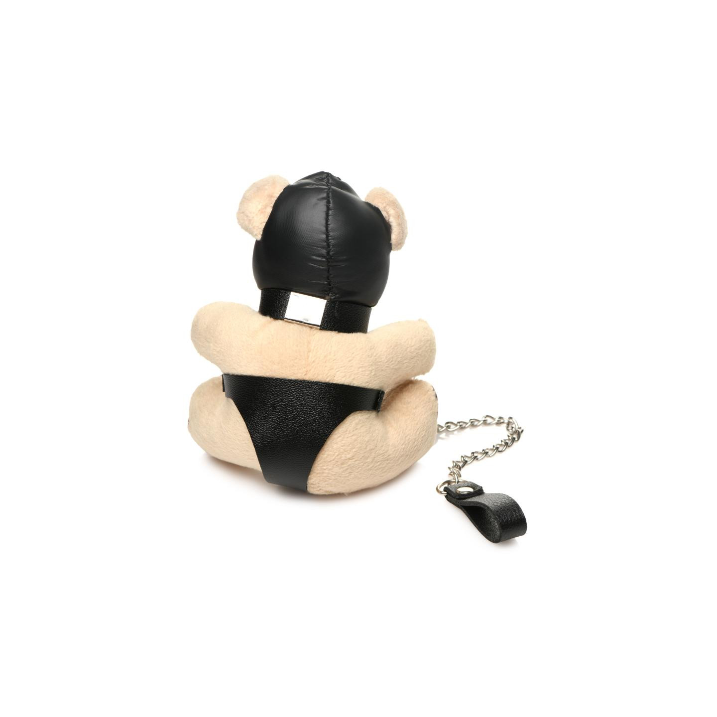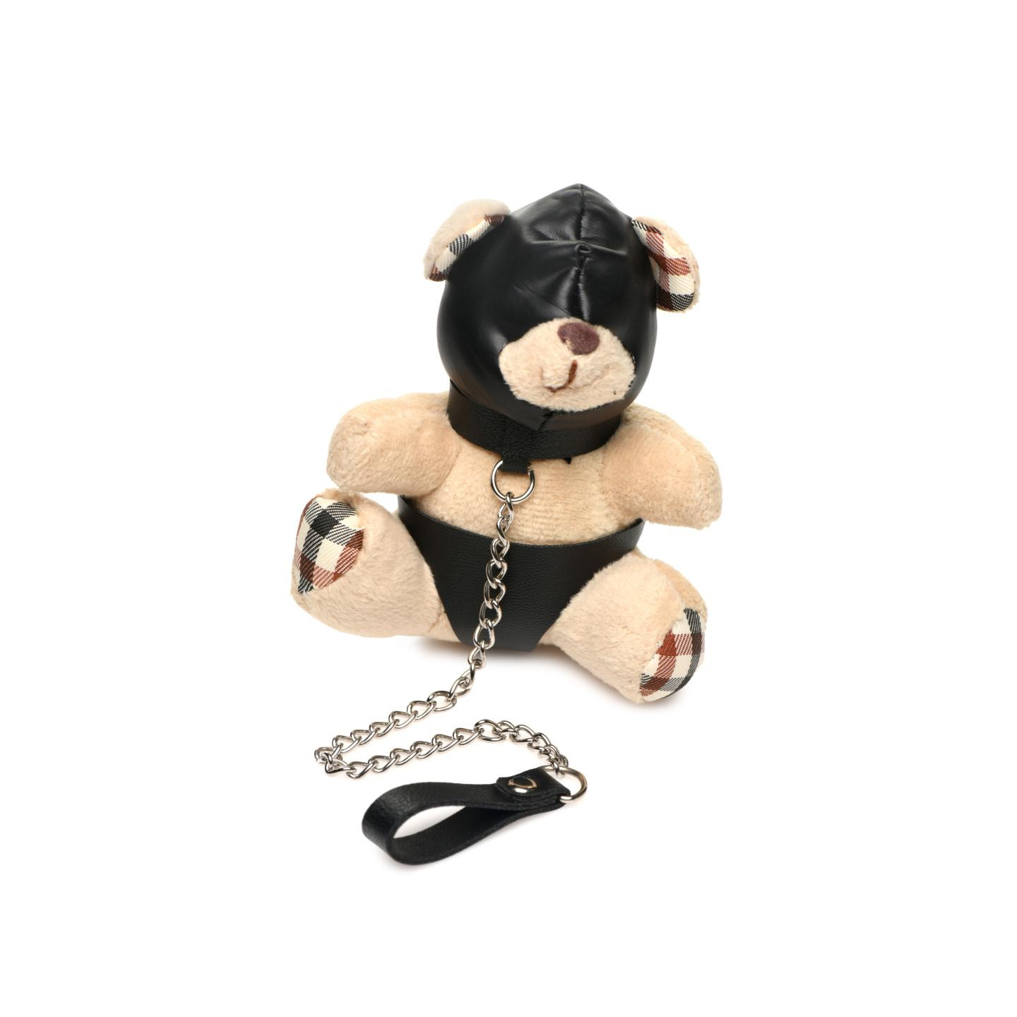 Affichez vos envies avec ce petit ours beige tenu en laisse et vêtu d'une cagoule et d'un slip BDSM.