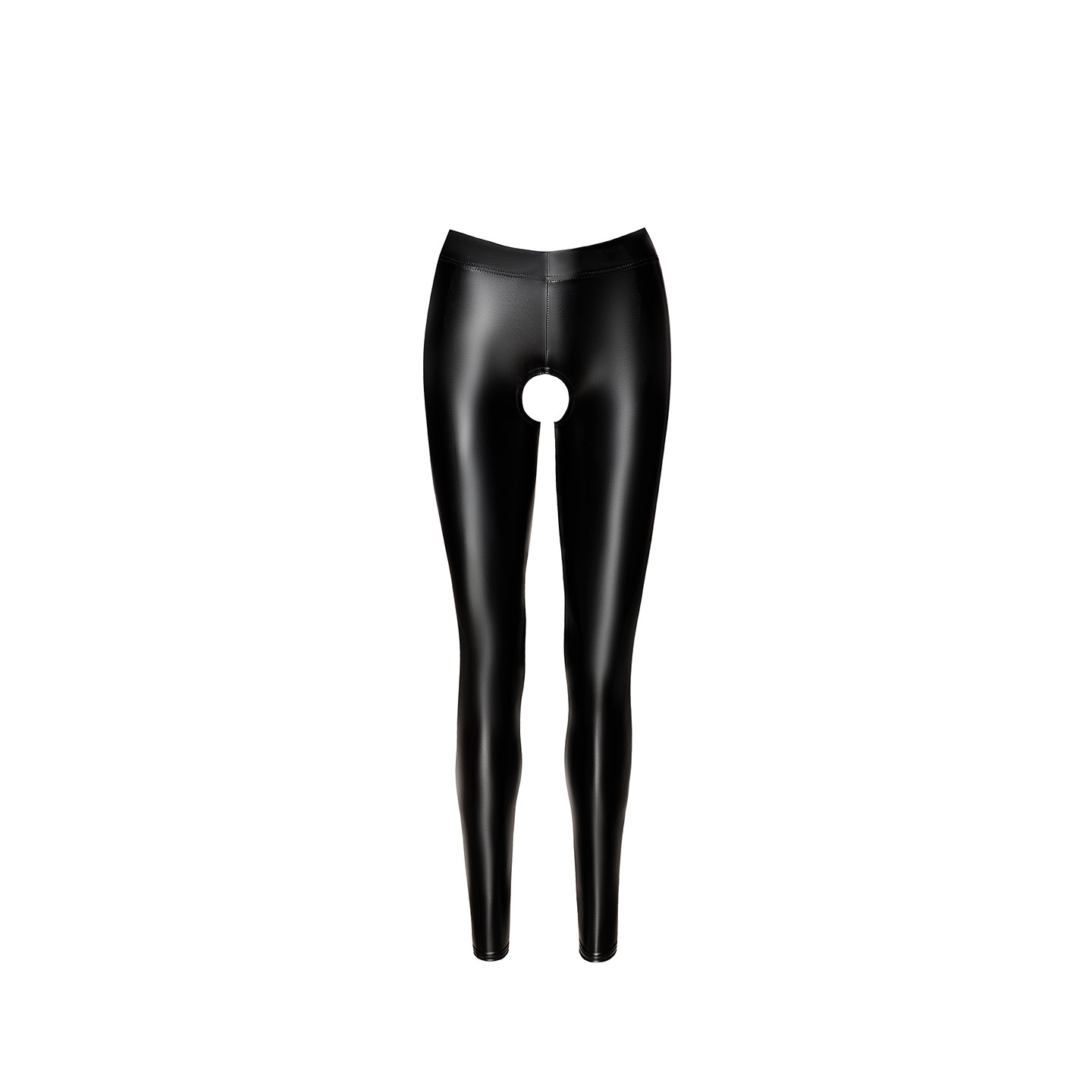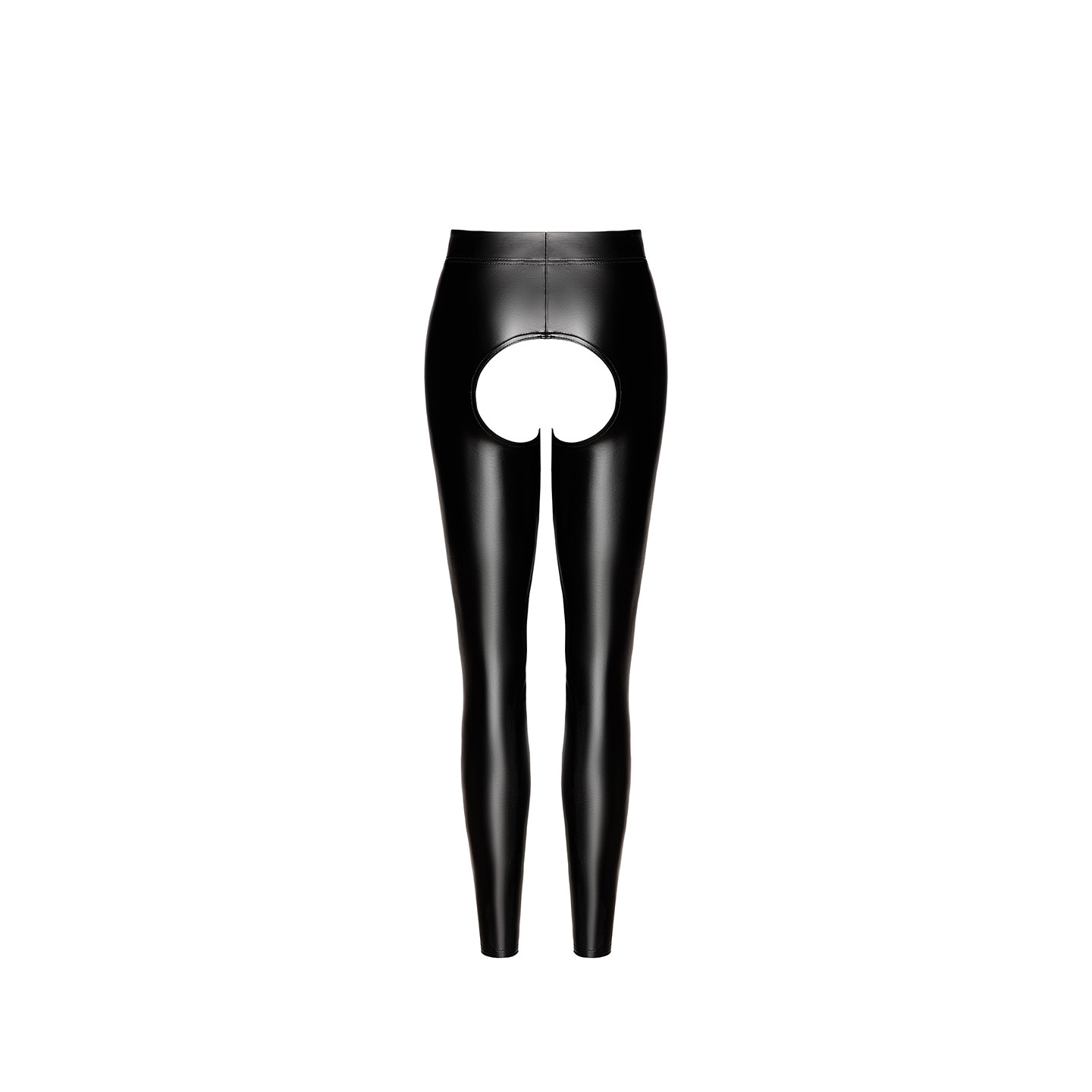 Leggings en wetlook mat moulant, avec une ouverture chaps large et arrondie sur l'entre-jambe.
