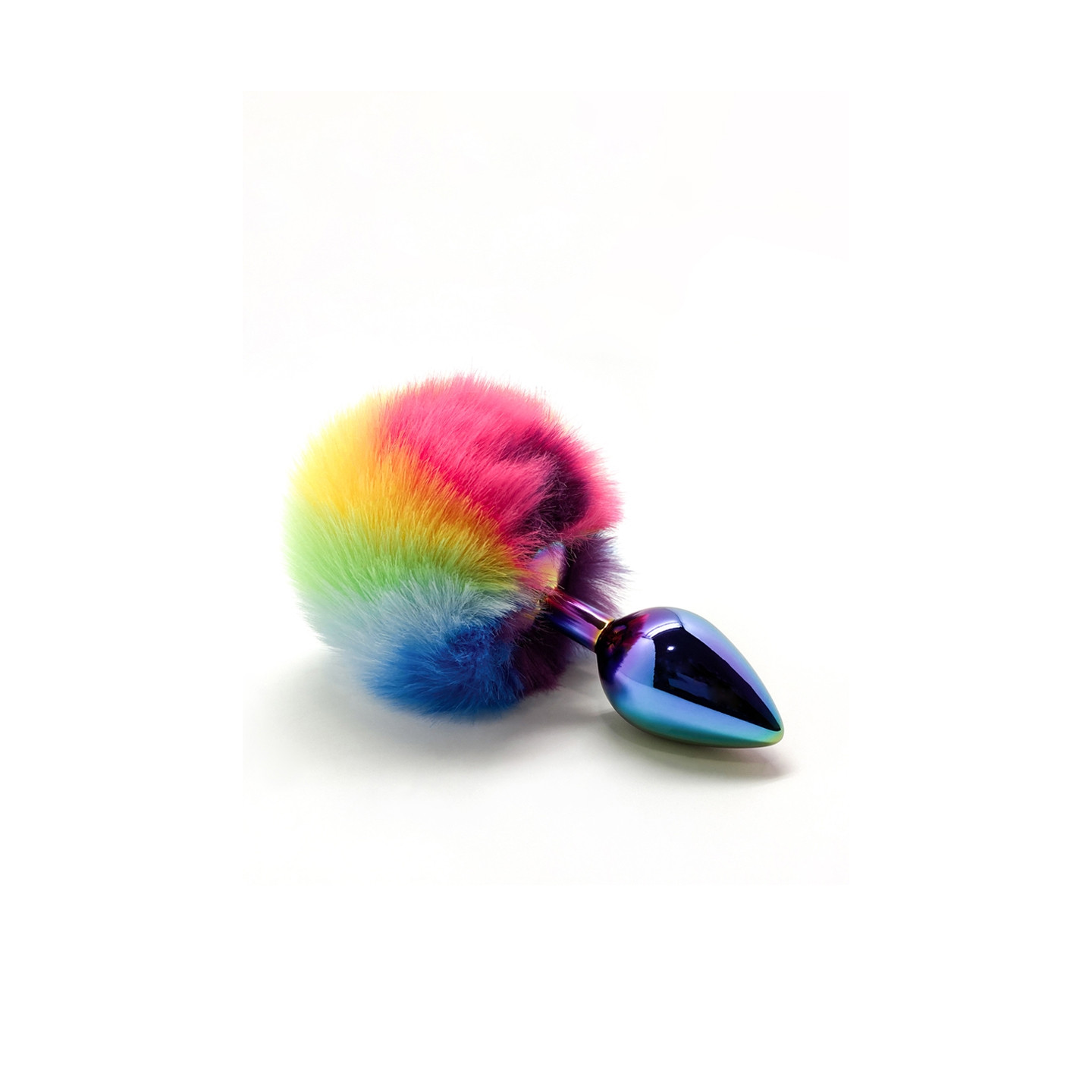 Tout autant sextoy anal, bijou coquin qu'accessoire de jeu BDSM, le plug Filippi Raimbow taille medium de chez Wooomy est un jouet intime particulièrement original et sexy avec ses couleurs LGBTQ+ friendly et son pompon en fourrure synthétique fixé à son extrémité.