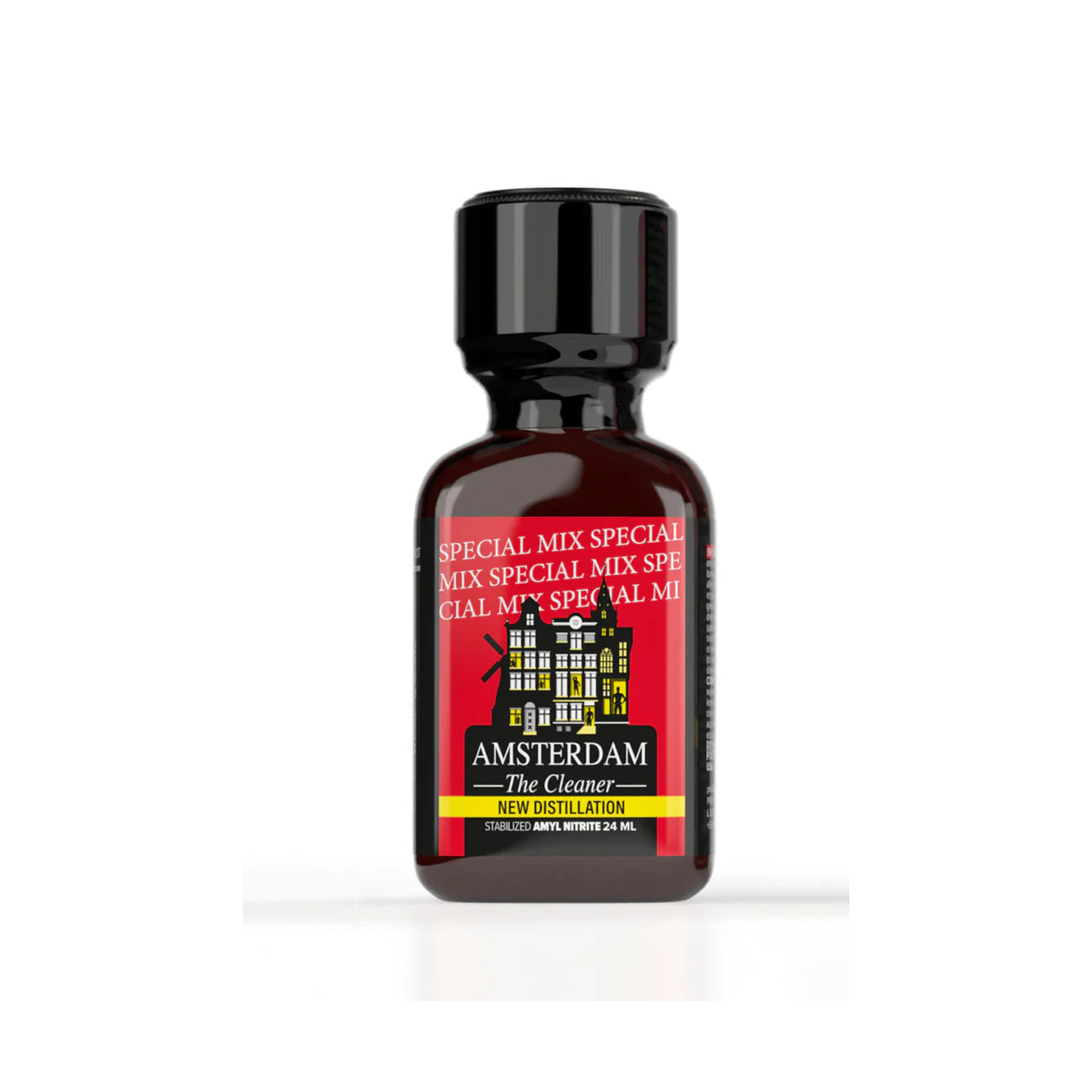 Le Poppers Amsterdam Spécial 24 ml est un arôme très fort composé de nitrite d'Amyle. Son effet monte en puissance lentement mais dure bien plus longtemps que les poppers classiques à base de nitrites de propyl.