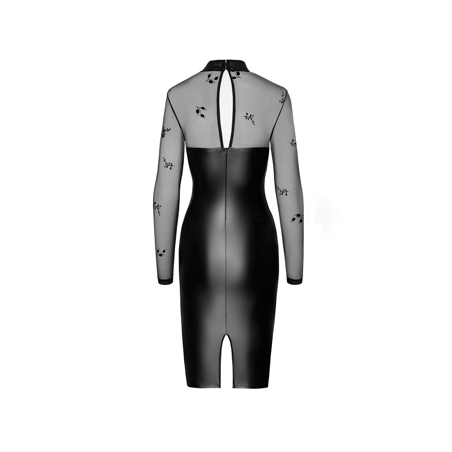 Robe mi longue très moulante de femme fatale, au corps de wetlook moulant, et tulle transparent floqué de petits motifs de fleurs.
