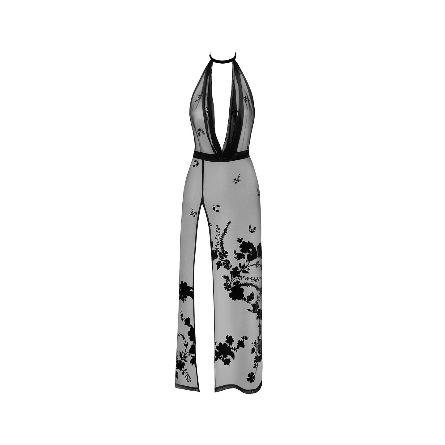 Robe longue dos nu en tulle transparent floqué d'un motif de fleurs