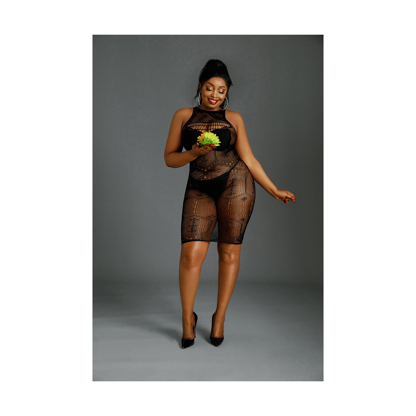 La marque de lingerie Moonlight présente son modèle n°06 Queen Size, une robe courte et ultra sexy en maille, avec des motifs géométriques et des effets de transparence sur les zones les plus intimes.