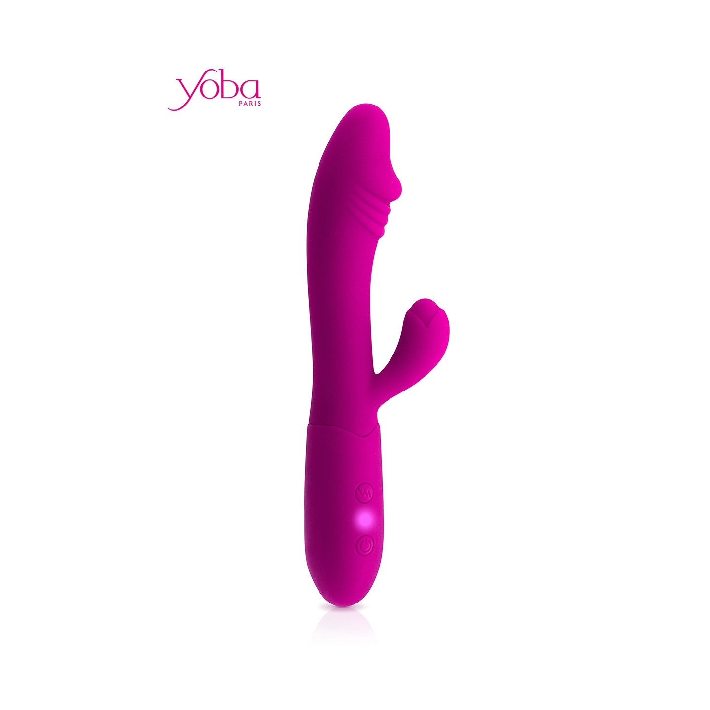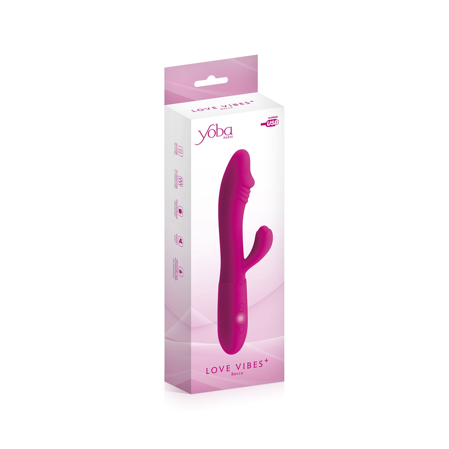 Le vibromasseur Rabbit Becca de la marque Yoba est un sextoy rechargeable de qualité dédié au plaisir féminin. Il stimule en même temps le vagin, tout particulièrement la zone du point G grâce à sa forme incurvée et sa tête en forme de gland réaliste avec de petits reliefs, et le clitoris grâce à son petit ergot stimulant judicieusement placé.