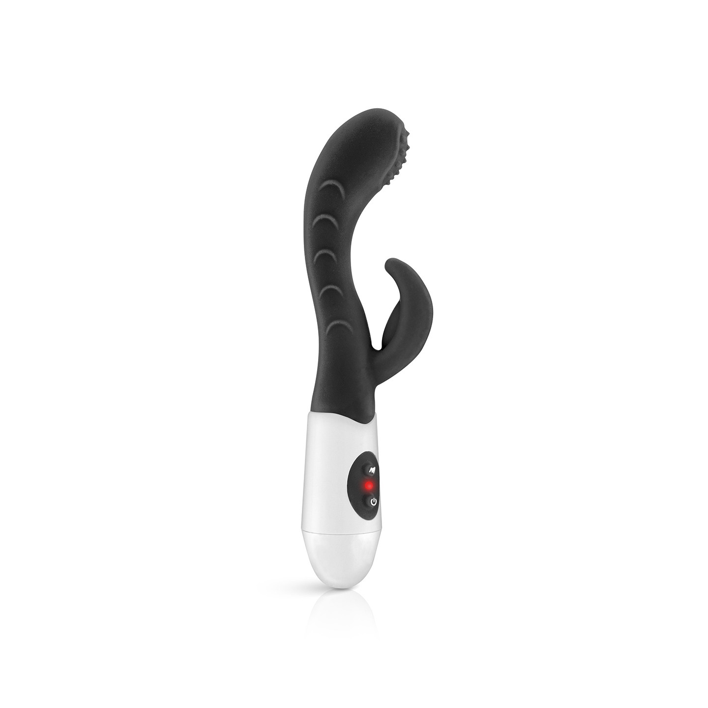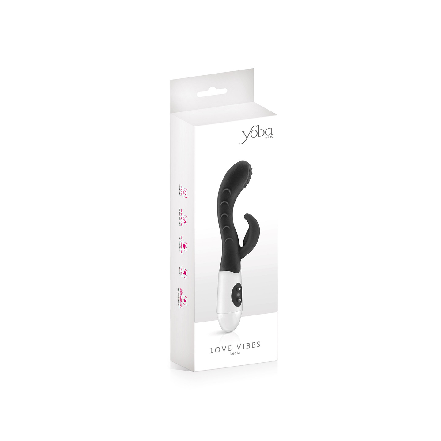 Le vibromasseur Rabbit Leola (coloris noir) de la marque Yoba est un sextoy de qualité dédié au plaisir féminin. Il stimule en même temps le vagin, tout particulièrement la zone du point G grâce à sa forme incurvée et sa tête avec tête arrondie dotée de picots, et le clitoris grâce à son petit ergot stimulant judicieusement placé.